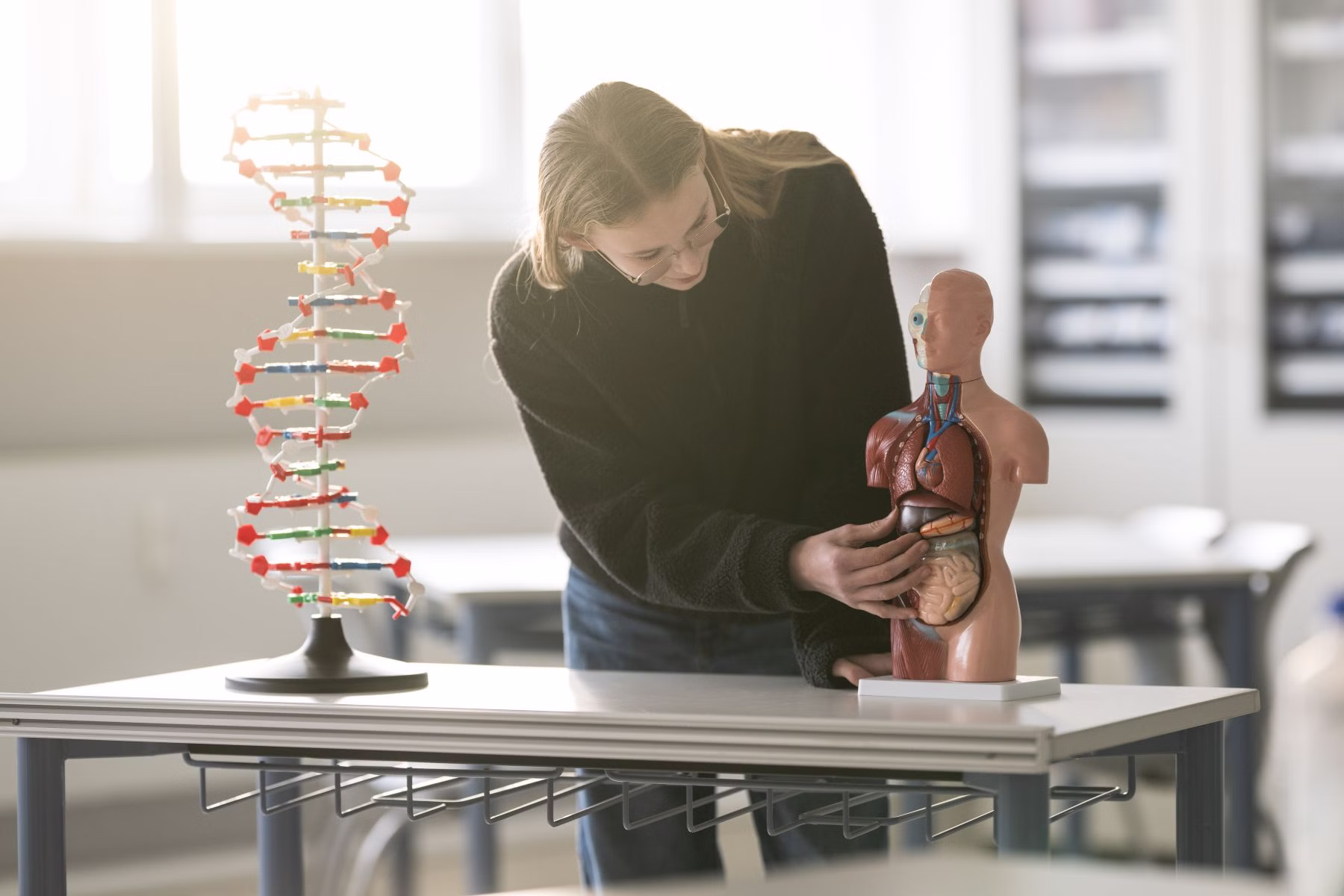Leicht verständliches Molekülmodell der DNA-Doppelhelix aus Kunststoff: die Basen werden durch flache Kunststoffkörper in vier unterschiedlichen Farben symbolisiert. Durch die Formgebung des Modells ist es nur möglich, die jeweils komplementären Basen (Adenin und Thymin, Guanin und Cytosin) zusammenzustecken. Die Pentosephosphat-Hauptkette wird ebenfalls aus Desoxyribose- und Phosphat-Elementen zusammengesteckt.