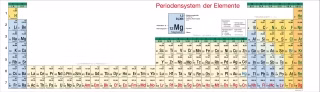 Zusätzlich werden Aggregatzustände, Haupt- und Nebengruppenelemente, Metalle, Nichtmetalle, Halbmetalle und Edelgase durch eine unterschiedliche Farbgebung gekennzeichnet. Die Wandklapptafel hat verzinkte Tafelschaniere.