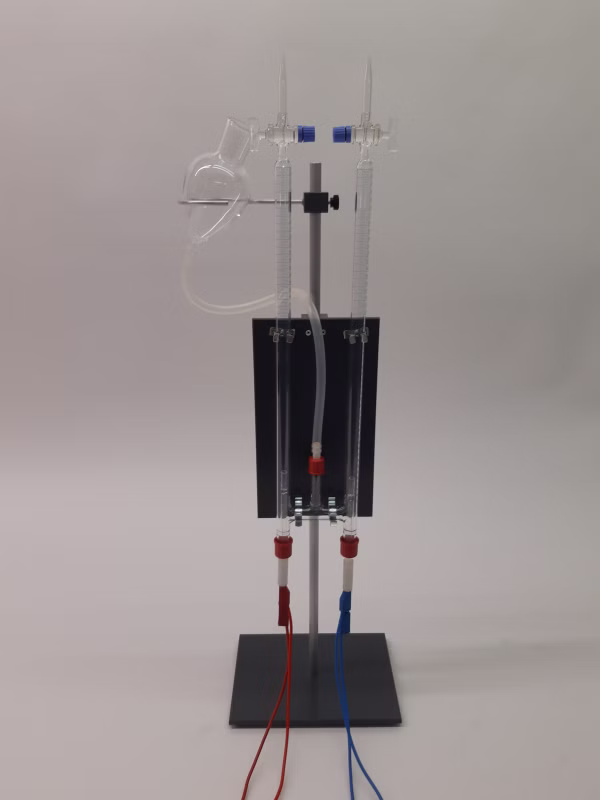 Wasserzersetzungsapparatur nach Hoffmann (Komplettset inkl.Stativ und Elektroden) - Besonders zur Elektrolyse von Wasser und zur quantitativen Bestimmung der dabei entstehenden Gasmengen geeignet. Die Ausführung des Wasserzersetzungsapparates mit Schraubverbindungskappen gewährleistet eine sichere Halterung der Elektroden. Der Siliconschlauch und das Niveaugefäß ermöglichen durch Anheben oder Absenken des Niveaugefäßes den Druckausgleich eingeschlossener Gase mit dem Luftdruck und somit exaktere Messwerte. Das ist besonders wichtig bei der Verwendung des Apparates als Coulombmeter bzw. bei der Erarbeitung der Faraday-Gesetze. Der Apparat kann mit Hilfe von Klemmen an jedem Stativ befestigt werden.