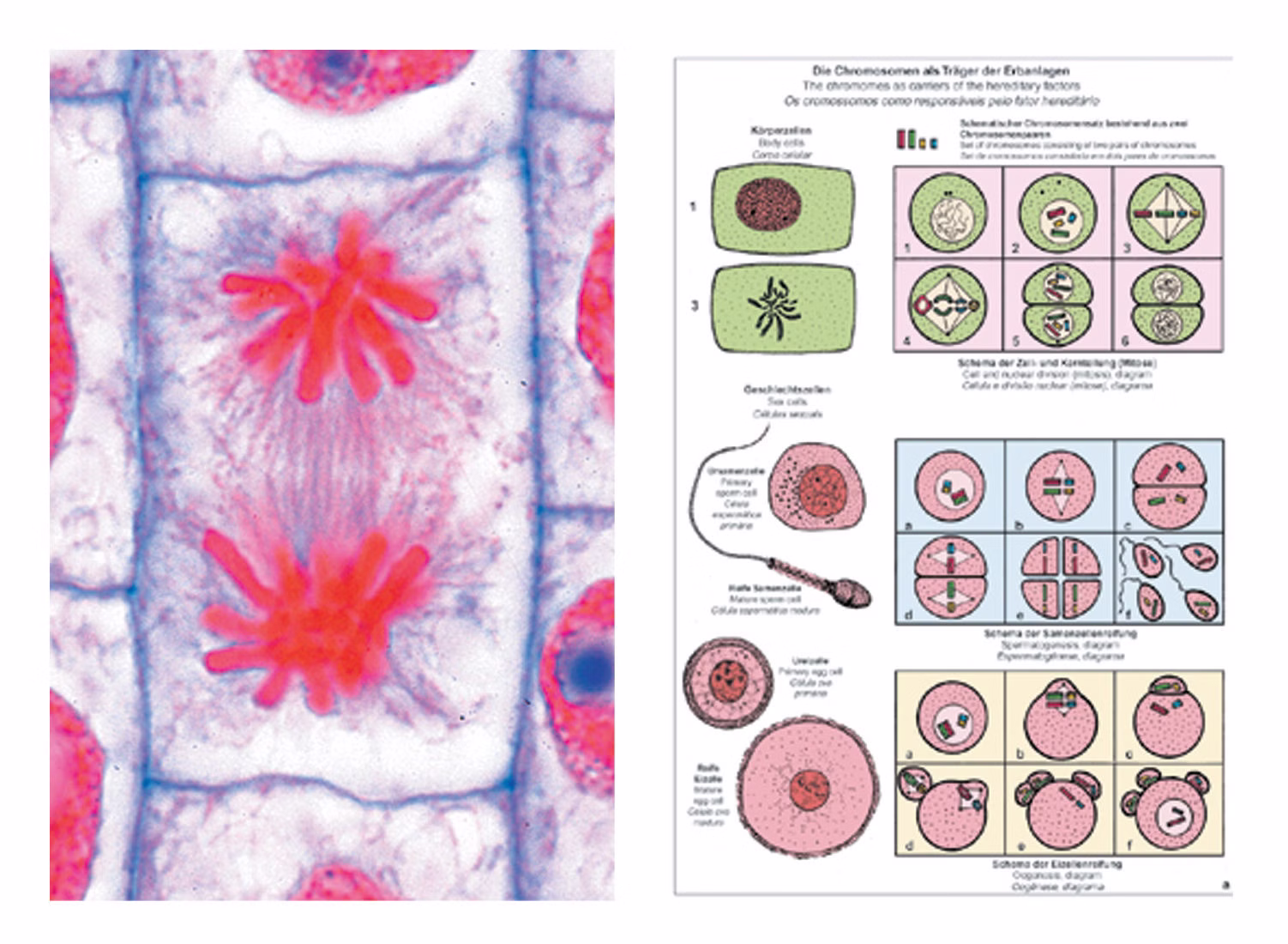 SMD-21 Multimedia-Lehrerpaket: Mitose und Meiose (Zellteilung), Basissatz von 6 Präparaten. 6 Mikropräparate im Plastikkasten, 3 Farbige Overhead Transparente, 6 Arbeits- und Zeichenblätter als Kopiervorlagen, Textheft mit Erläuterungen, Aufbewahrungskarton. 1. Zellteilungen (Mitosen). Wurzelspitzen von Allium cepa, Küchenzwiebel, längs. Alle Teilungsstadien in einem Präparat. Färbung mit Eisenhämatoxylin nach Heidenhain - 2. Mitosen in der Keimscheibe eines Fisches (Coregonus), Schnitt. Zentrosphären - 3. Hoden der Maus, quer. Spermatogenese - 4. Riesenchromosomen aus der Speicheldrüse der Chironomuslarve, Quetschpräparat, Spezialfärbung - 5. Lilium, Antheren quer. Pollenmutterzellen, späte Prophase. Pachytän-bis Diakinesestadien, Übersichtspräparat - 6. Lilium, Antheren quer. Pollenmutterzellen, Metaphase und Anaphase der zweiten (homöotypischen) Reifungsteilung (Mitose).