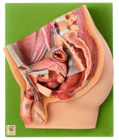 natürliche Größe, aus SOMSO-Plast®. Mastdarm, Harnblase mit Prostata und Ductus deferens, sowie die äußeren Geschlechtsorgane vollplastisch modelliert. Insgesamt 4teilig. Auf grüner Grundplatte.