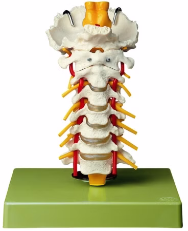 Naturabguß, aus SOMSO-Plast®. Beweglich montiert, mit Hinterhauptschuppe, Rückenmark, Medulla oblongata und Nervenabzweigungen. Darstellung der Arteria vertebralis. Laminektomie bei C 4. Auf Stativ (abnehmbar) mit grünem Sockel.