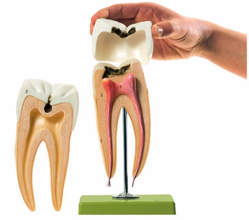 ca. 8fach vergrößert, aus SOMSO-Plast®. In 3 Teile zerlegbar. Mit Darstellung der beginnenden und fortgeschrittenen Karies. Auf Stativ mit grünem Sockel.