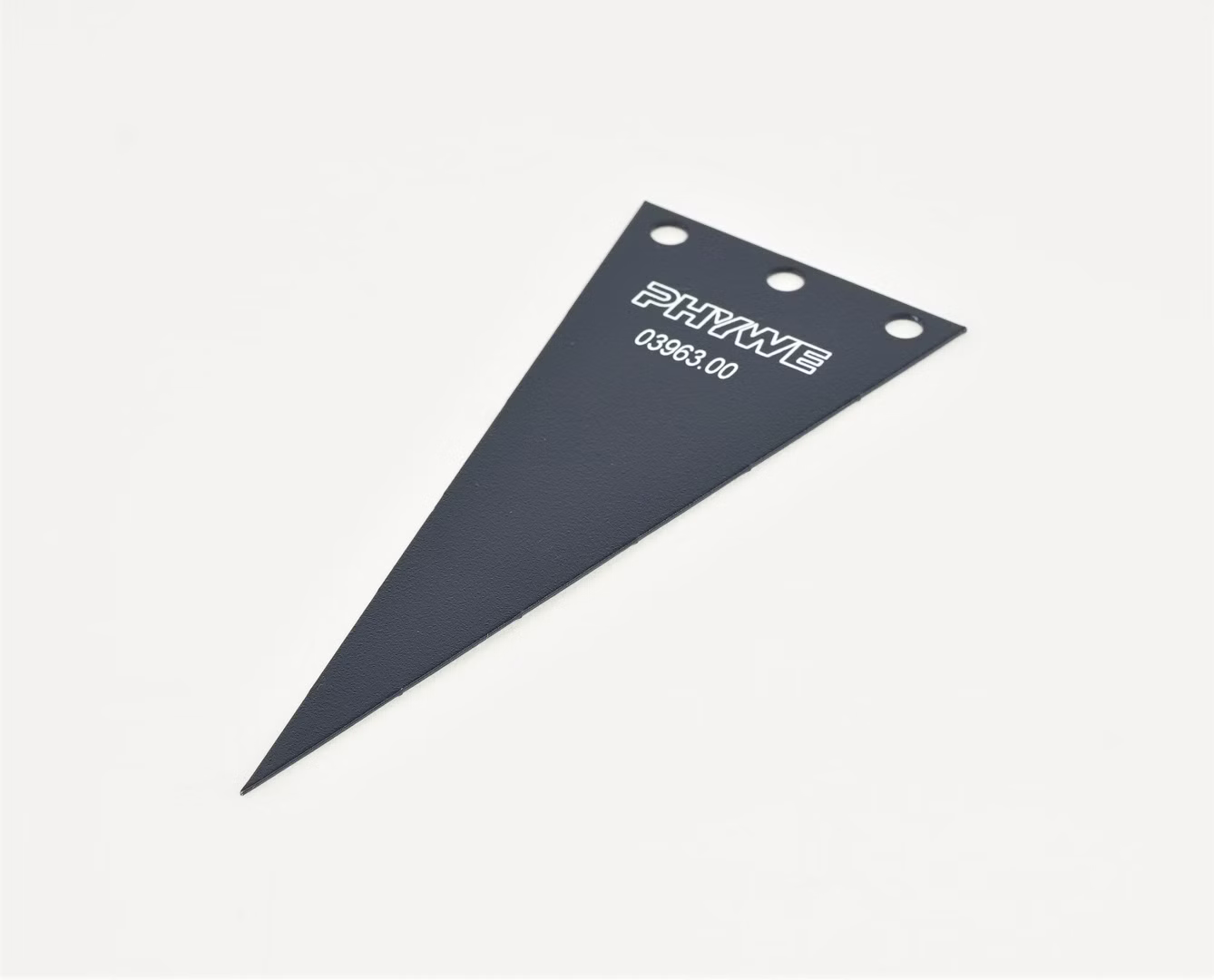 Spitzwinkliges, blau lackiertes Metallblech; mit drei Bohrungen zum Einhängen in die Stifte des Hebels.