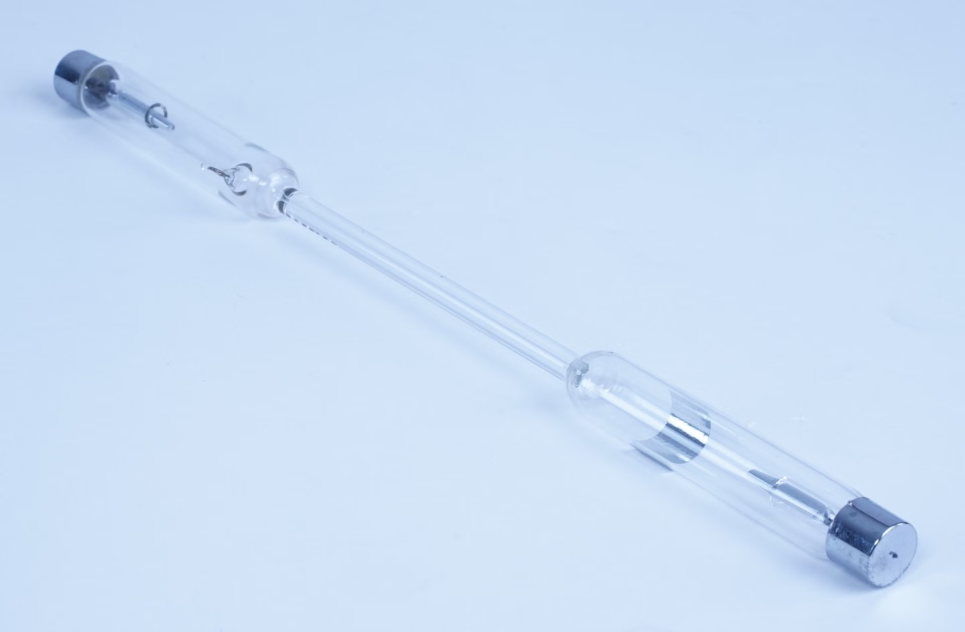 • Glasgasentladungsröhre mit Metallendkappen und  Anschlussstiften.