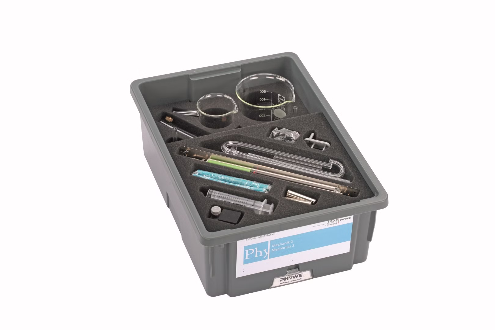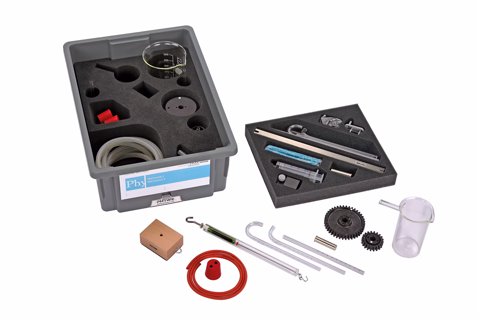 Das Geräteset besteht aus einer Aufbewahrungsbox und enthält alle grundlegenden Komponenten, die für die Durchführung der Versuche erforderlich sind. Die stabile, stapelbare Box ist mit einem passgenauen Schaumstoffeinsatz ausgestattet, der die Komponenten schützt und eine schnelle Kontrolle auf Vollständigkeit ermöglicht.