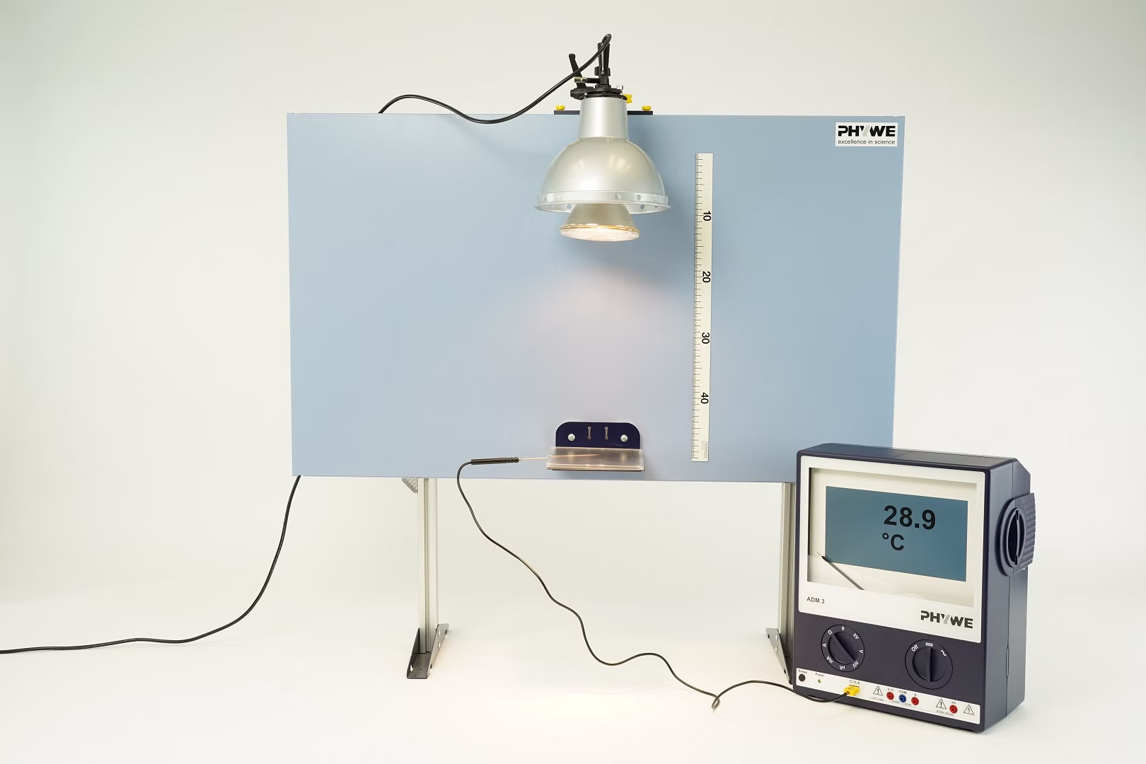 In diesem Versuch wird eine schwarze Platte, die den Erdboden simuliert, mit Hilfe von Strahlungsenergie erwärmt. Durch die Abdeckung mit einer Plexiglasplatte im zweiten Teil des Versuches soll der Treibhauseffekt verdeutlicht werden.